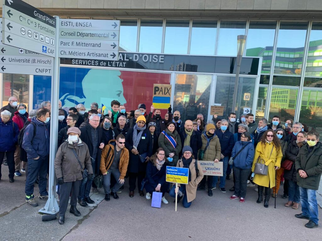 Nous nous sommes réunis ce matin sur le parvis de la préfecture du Val-d’Oise à Cergy pour exprimer notre soutien à l’Ukraine et son peuple. Nous avons pu entendre le témoignage d’un ressortissant ukrainien sur les premières heures du conflit. Ce rassemblement a également permis de mettre en relation toutes les bonnes volontés pour contribuer à la mise en place des premières actions de solidarité. Ce moment s’est conclu par la diffusion de l’hymne ukrainien.
